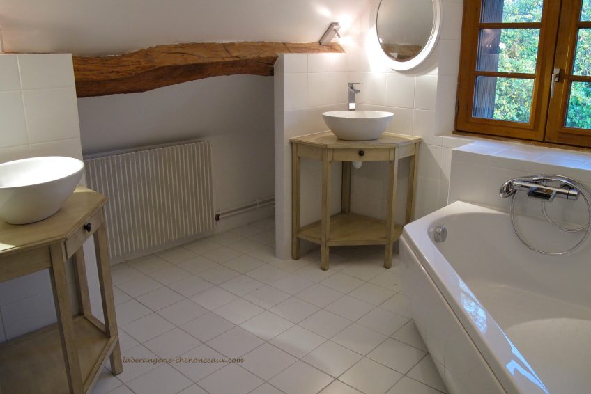 A partir de 2 nuits de séjour le prix de la nuit passe de 110,€ à 95,€ La suite est constituée d’une grande chambre avec un lit de 160 cm de largeur, et, séparée par une porte, d’une chambre avec deux lits (de 90x200cm chacun) donnant sur la salle de bains qui comporte une baignoire et deux vasques. WC séparé à l’intérieur de la suite.
